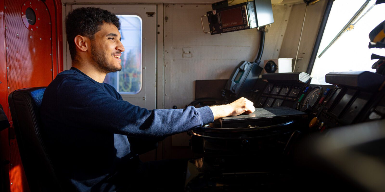 Een machinist is een belangrijke schakel binnen projecten van Strukton Rail: hij vervoert de machines en materialen naar de werklocaties. Een verantwoordelijke en afwisselende functie, zegt Anwar Ben Mansour, die zelf sinds een half jaar in de cabine staat.