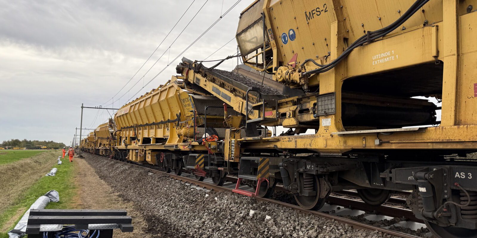 Zoals bij elk groot project kwamen er ook dit weekend uitdagingen op ons pad. Door een grote calamiteit arriveerde de ballastafvoermachine veel later dan gepland, waardoor we acuut een tekort aan kranen hadden om de ballast goed af te werken. Alsof dat nog niet genoeg was, raakte tijdens het transport vanaf het depot de vernieuwingstrein beschadigd door een nog onbekende oorzaak. Het gevolg: vijf uur vertraging en een flinke puzzel om het plan aan te passen en toch productie te draaien.