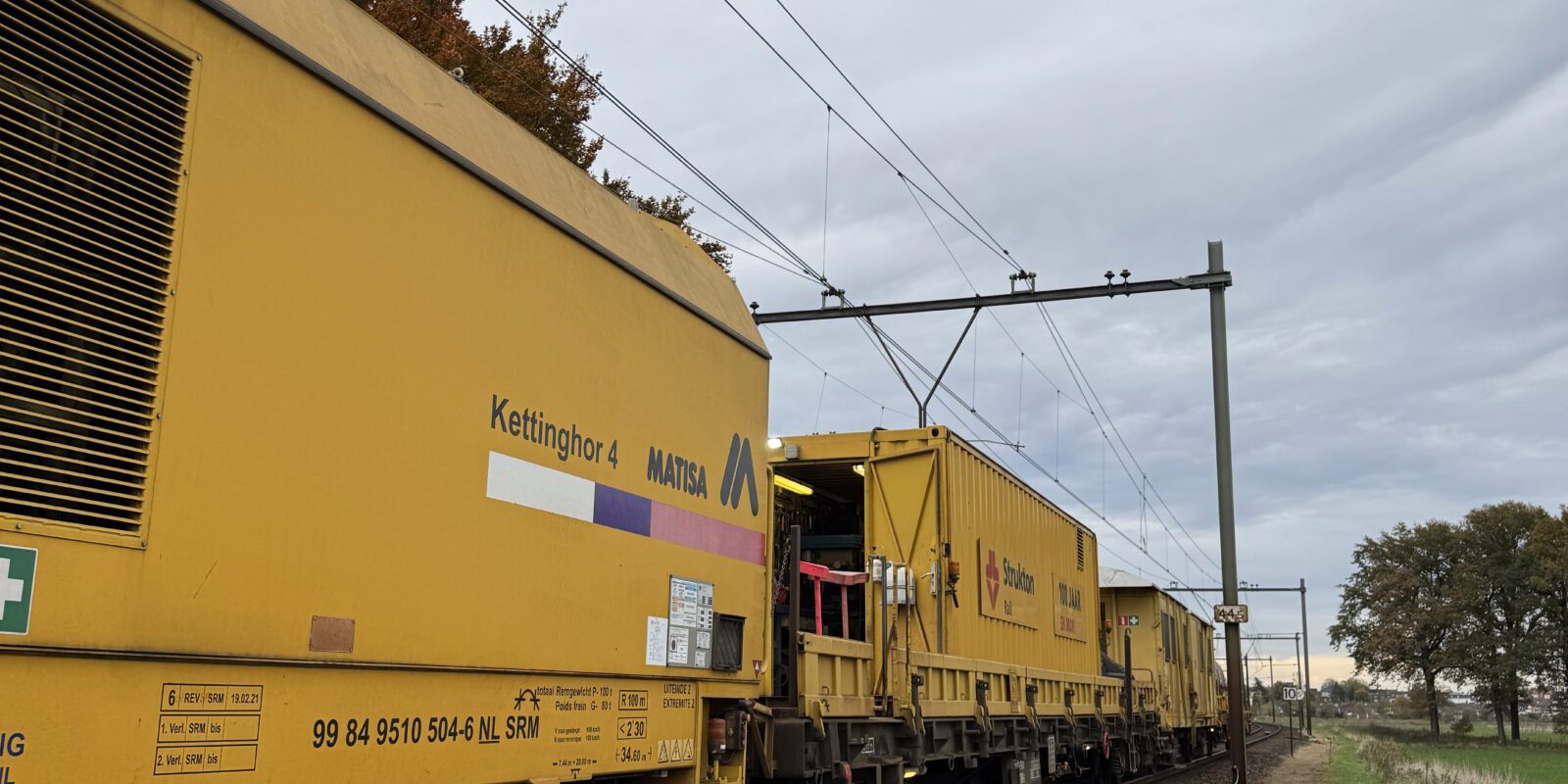 In drie dagen tijd vernieuwden we 3,5 kilometer spoor met de vernieuwingstrein en reinigden we 2,9 kilometer ballast met de kettinghor. Op het werkterrein was het een indrukwekkend gezicht: grote machines zoals de vernieuwingstrein, de kettinghor, de stopmachine CSM en de ballastprofileermachine, aangevuld met talloze krollen en monteurs van de disciplines Kabels & Leidingen en Seinwezen. Alles draaide om één doel: het spoor op tijd en volgens plan opleveren!